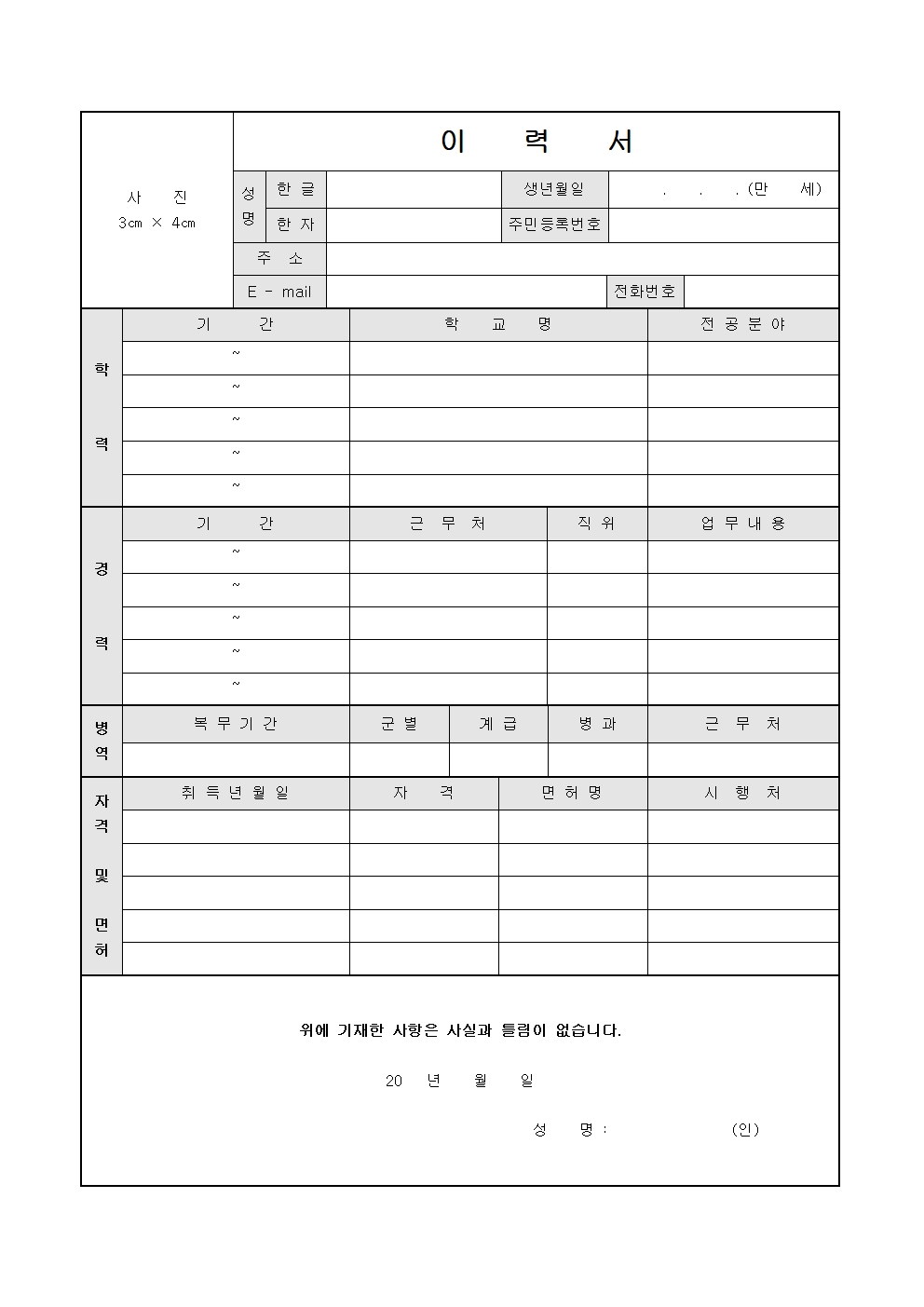 만약 허위사실이 밝혀지면 입사 취소의 우려도 생길 수 있으니 한글 이력서 양식을 작성할때는 거짓없이 자신의 정보를 바르게 입력하도록 합니다.