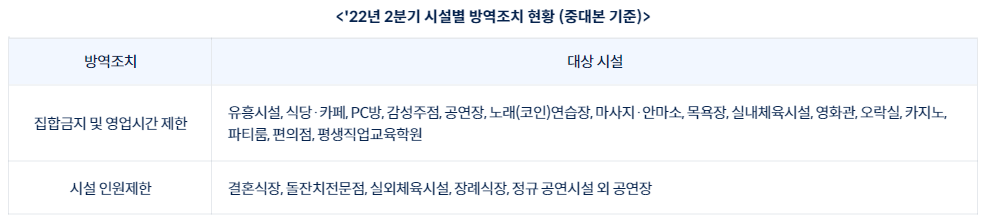 - 시설 인원 제한 시설 : 결혼식장, 돌잔치 전문점, 실외체육시설, 장례식장, 정규 공연시설 외 공연장