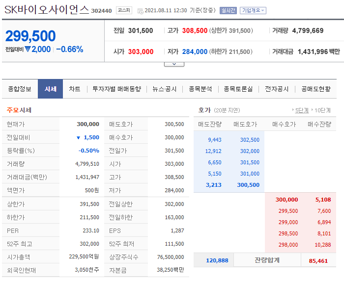 8월 11일 오전 SK바이오사이언스는 전일 대비 2000원(0.66%) 내린 29만9500원에 거래되기도 했습니다.