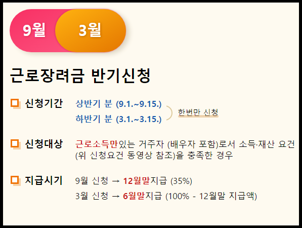 만약 이번 9월에 2023년 귀속 상반기분 근로장려금을 신청한 가구는 2023년 귀속 하반기분 근로장려금도 신청한 것으로 간주하여 2024년 3월에는 신청할 필요가 없습니다.