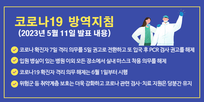 2023년 5월 11일 발표한 코로나 격리 의무 해제와 팬데믹 종료 안내입니다.