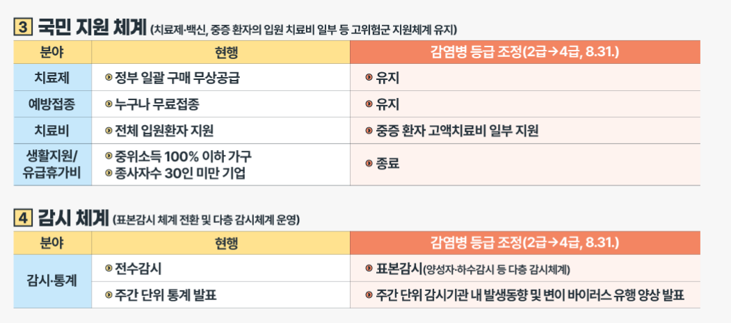 | 분야 | 현행 | 감염병 등급 조정(2급→4급) | |