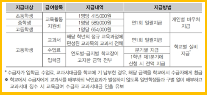 교육급여는 중위소득 50% 이하에 제공됩니다. 초등학생, 중학생, 고등학생로 구분해 교육활동 지원비와 교과서 지원비, 입학금 및 수업료가 지원됩니다.