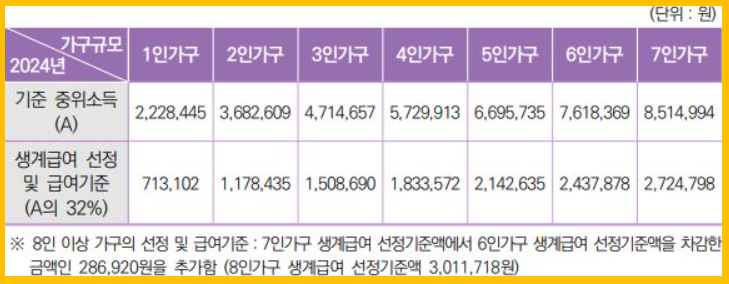 2024년 생계급여 조건은 소득 인정액이 기준 중위소득의 32% 이하인 가구에 해당이 됩니다.