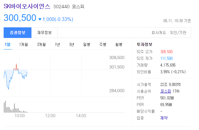 8월 11일 오전 SK바이오사이언스는 전일 대비 2000원(0.66%) 내린 29만9500원에 거래되기도 했습니다.