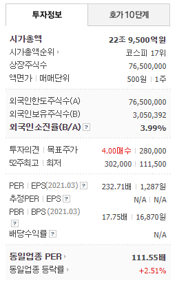 현재 시가총액도 22조9118억원으로 불어나 유가증권시장 17위에 올라온 상태 입니다.