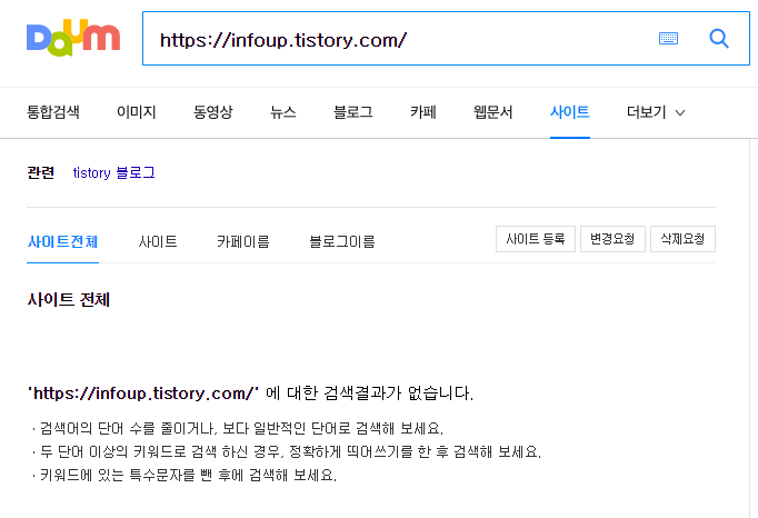 티스토리 저품 확인 하는 방법은 많이 찾아 보셨을 겁니다.다음 검색에서 내 블로그를 검색했을때 사이트 영역에서 아무것도 뜨지 않으면 저품이라고 하네요.제 블로그를 검색해 보았습니다.