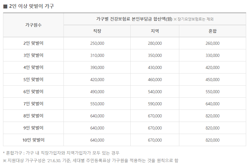 외벌이 4인가구를 기준으로 건강보험료 직장 가입자는 30만 8300원보다 적은 경우 신청 대상이 됩니다.