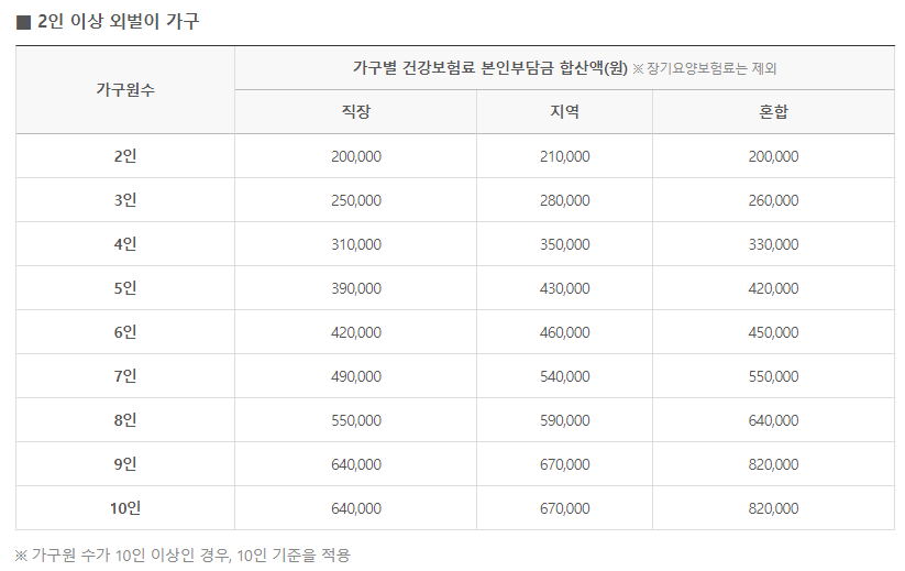 | 가구원수 | 가구별 건강보험료 본인부담금 합산액(원) ※ 장기요양보험료는 제외 | ||