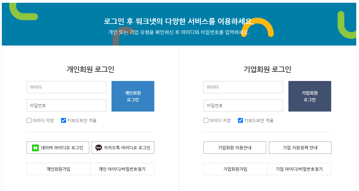 구직신청과 수급자격 인정 신청을 위해 워크넷에 가입합니다. 이미 가입이 되어 있다면 로그인을 합니다.