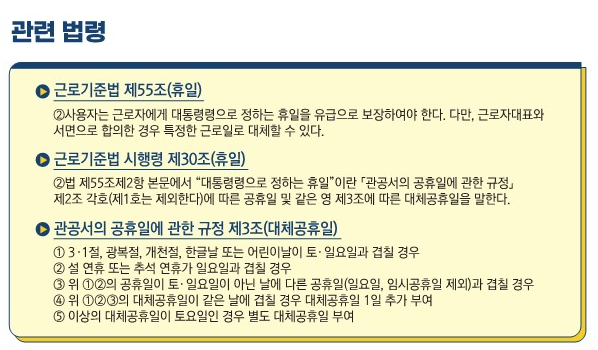 ② 사용자는 근로자에게 대통령령으로 정하는 휴일을 유급으로 보장하여야 한다. 다만, 근로자대표와 서면으로 합의한 경우 특정한 근로일로 대체할 수 있다. <신설 2018. 3. 20.>