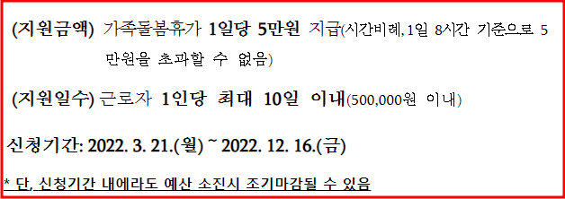 코로나19 가족돌봄휴가 지원금은 3월 21일(월) 부터 신청 및 접수가 이루어지고 있으며 22년 12월 16일(금)까지 신청을 받고 있습니다.