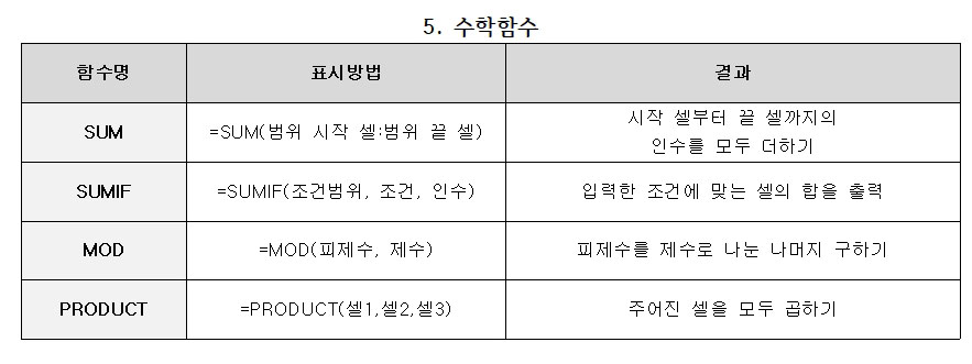 | SUM | =SUM(범위 시작 셀:범위 끝 셀) | 시작 셀부터 끝 셀까지의 인수를 모두 더하기 |