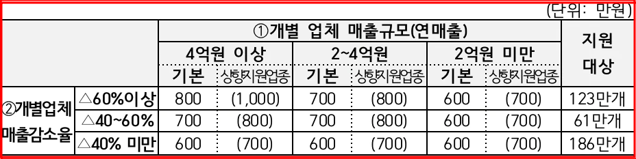 - 매출 2억원 이상 매출40%미만 600만원 지급(상향지원업종 700만원), 40%이상 700만원 (상향지원업종 800만원)