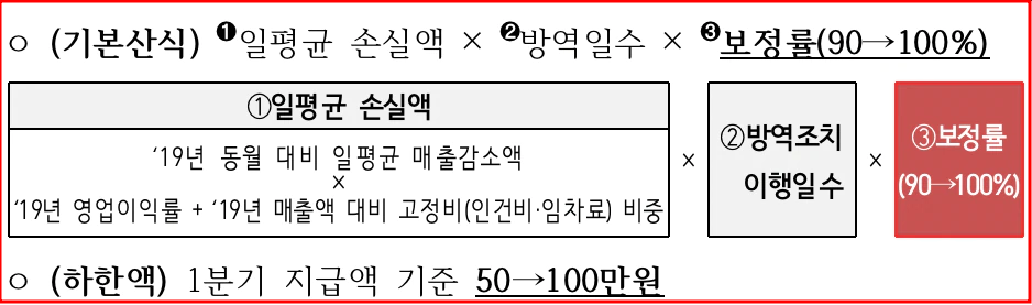손실보상 보정률은 현행 90%에서 100%로 상향하고, 분기별 하한액도 현행 50만원에서 100만원으로 확대하였습니다. 이 같은 조정은 더 많은 분들이 도움을 받을 수 있게 하기 위함입니다. 뿐만 아니라 물가 인상으로 살림이 더욱 어려워졌을 저소득층, 취약계층에게도 4인가구 기준 75~100만원 지급을 약속하기도 했습니다.
