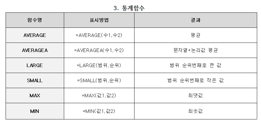 | AVERAGEA | =AVERAGEA(수1,수2) | 문자열+논리값 평균 |