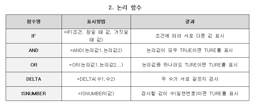 | AND | =AND(논리값1,논리값2) | 논리값이 모두 TRUE이면 TURE를 표시 |